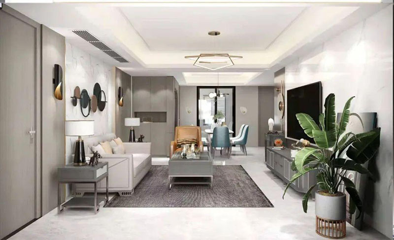 ▲設(shè)計(jì)師巧妙的運(yùn)用填充藝術(shù),將客廳電視與沙發(fā)背景色彩相呼應(yīng),利用凹凸互補(bǔ)的設(shè)計(jì)手法,傳遞著空間時(shí)尚。莫蘭迪實(shí)木家具,配以同色系的高級(jí)金屬底座,將精致輕奢從細(xì)節(jié)中脫穎而出。