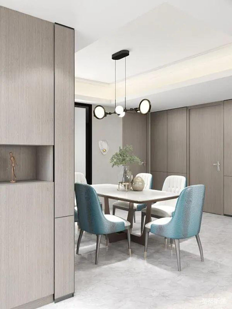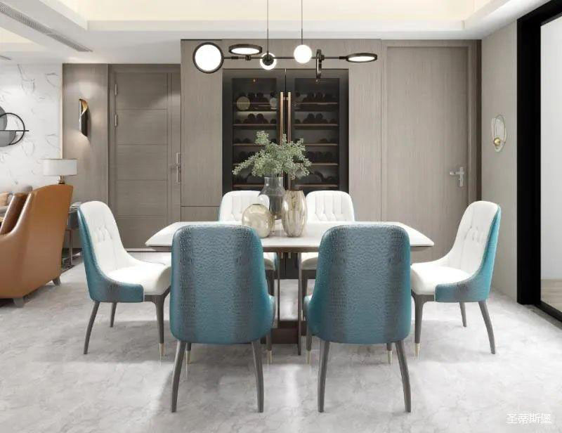 ▲澄亮湖藍(lán)的餐桌椅,一定是空間的點(diǎn)睛之處,溫柔跳脫的色彩,賦予了生活多姿多彩的體驗(yàn)。經(jīng)典黑的簡(jiǎn)約燈飾,在不忘溫馨氛圍的同時(shí),也引領(lǐng)著造型界的時(shí)尚潮流。