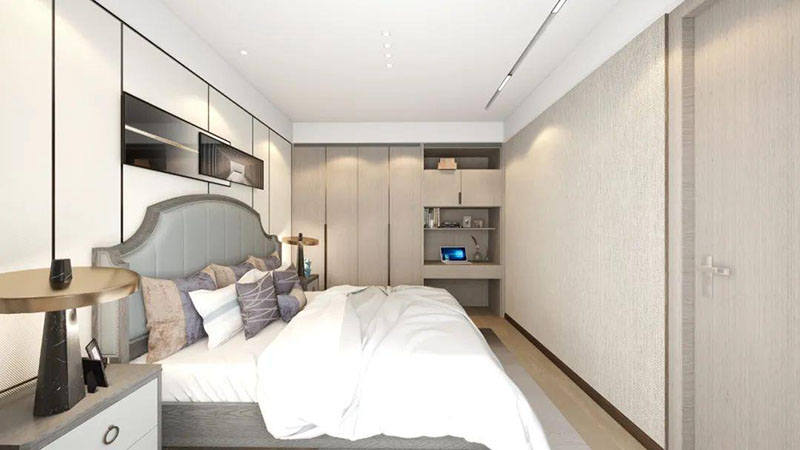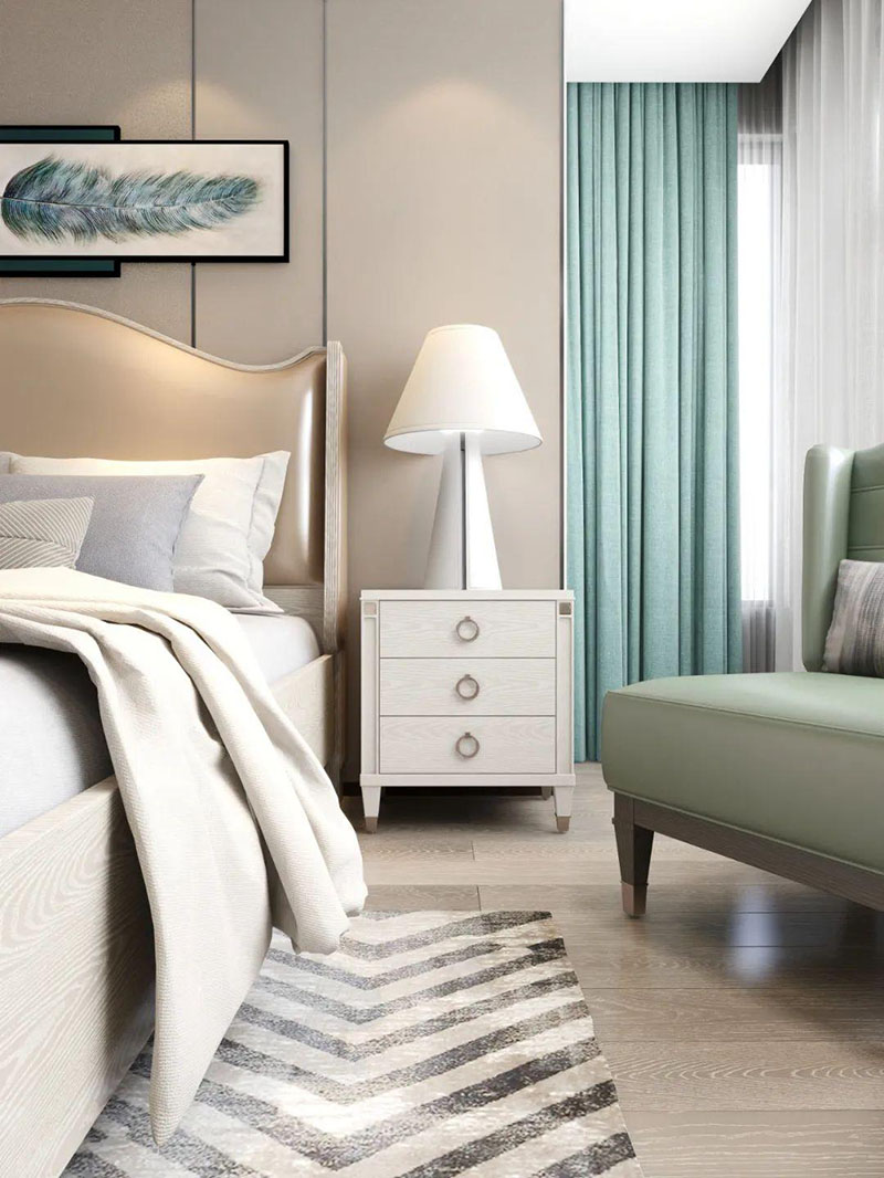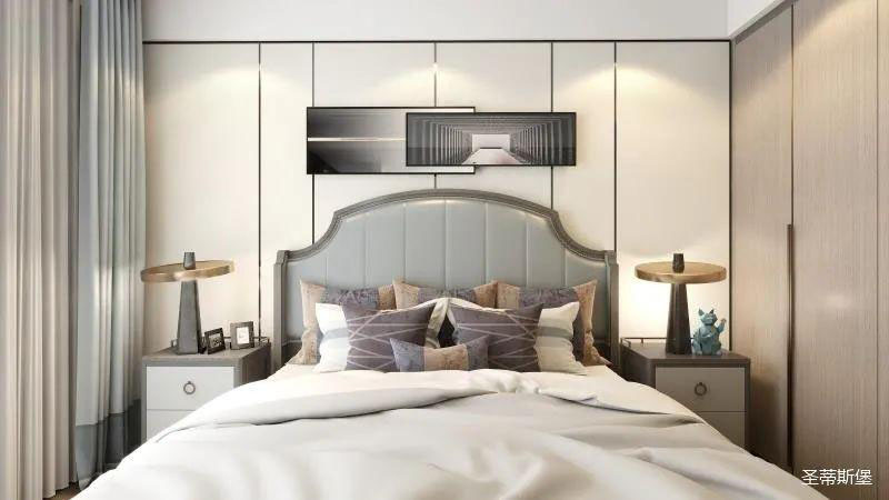 ▲次臥空間主要是以淺色為底調(diào),大面積的莫蘭迪色與淺色相平衡。極強(qiáng)線性裝飾畫帶來(lái)的延伸感讓視覺煥然一新。少許的金屬元素?cái)z入,瞬間提升了空間的精致度,將溫潤(rùn)雅致與時(shí)尚輕奢糅合在同一空間里,每一處都洋溢著浪漫的氣息。