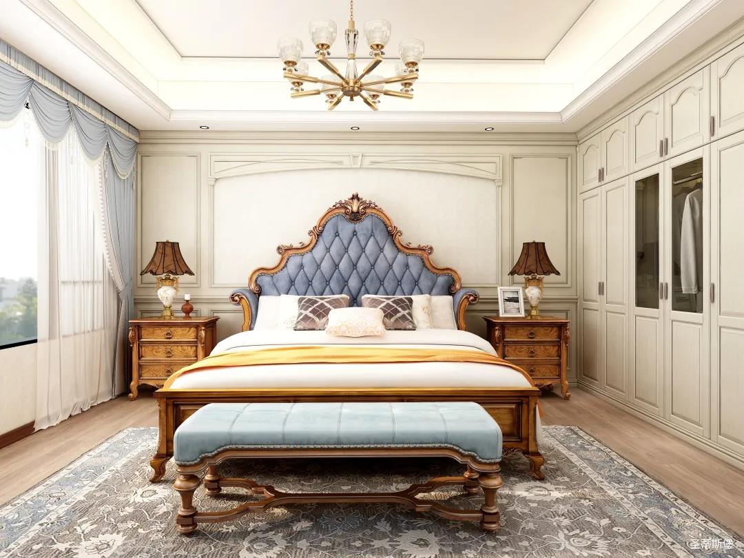 03主臥主臥設計運用現(xiàn)代的設計手法和材質(zhì)還原了古典氣質(zhì),以干練的線條傳達著溫馨的臥房。蜿蜒的波紋曲線,細膩精致的雕花,猶如隨風起伏的浪花,在清澈藍的床屏上跳躍,向靜態(tài)空間展示著活躍的動態(tài)效果。曲直線條完美融合,打造一個靈動而又精致的生活空間。