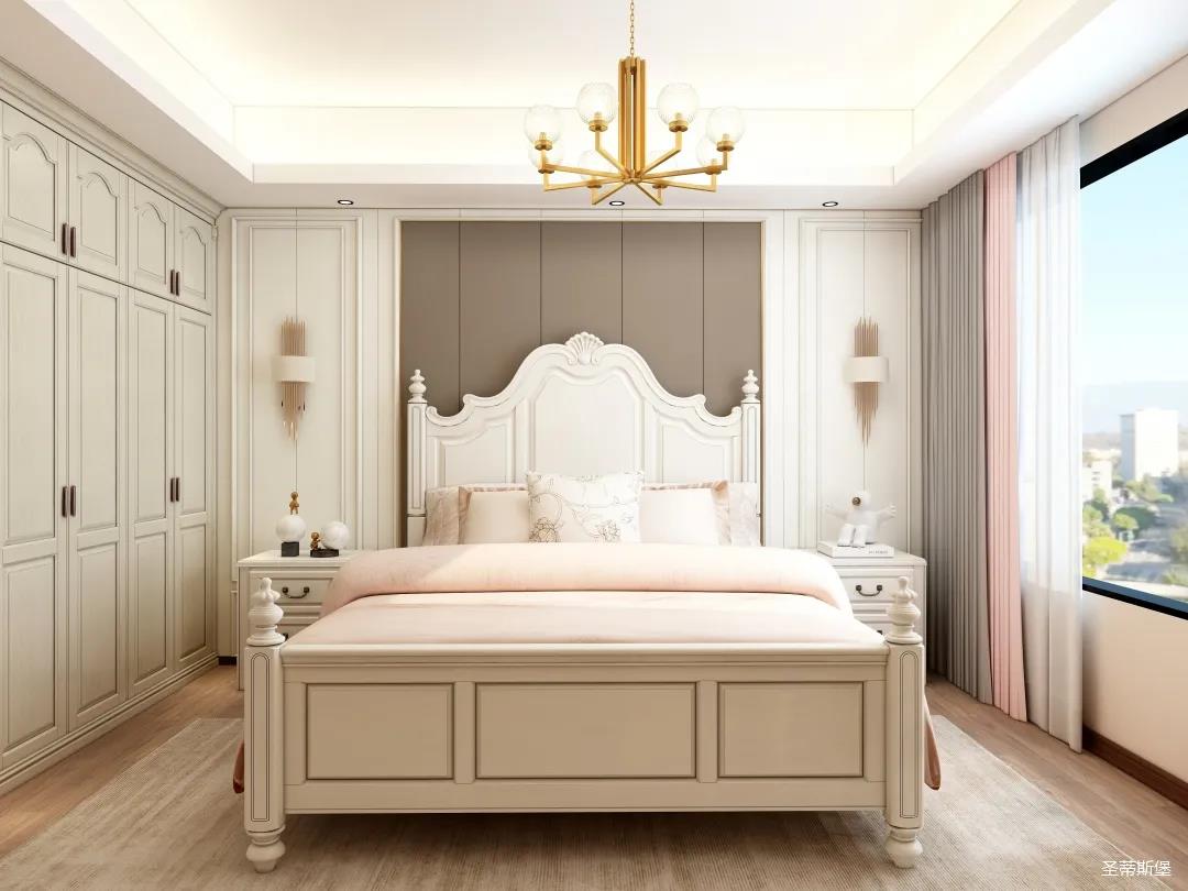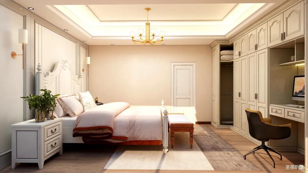 次臥的設計更注重收納,人性化嵌入式書桌,整排衣柜設計有效的利用了空間每一個角落。床屏在保持原有美式家具特色的同時,增加了線條美,將繁雜的雕琢簡化,并融入時尚的美式元素,壁燈,吊燈糅合自然光影,完美呈現(xiàn)出尊貴的空間格調(diào)。