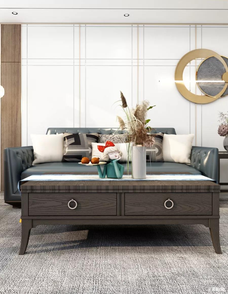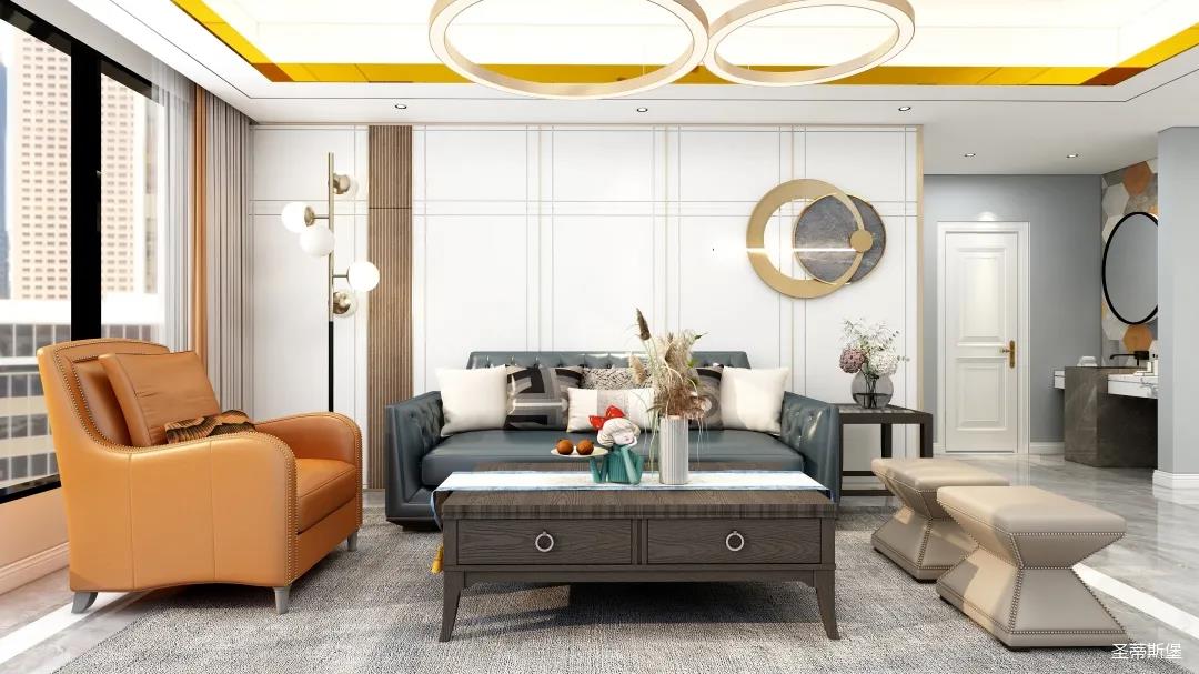 客廳延續著美式輕奢的氣韻,背景墻被簡約有序的金屬線條分割,營造出質感空間的細膩。沙發沉穩又不失時尚,色彩混搭更是讓人耳目一新,展現著美式風格天性自由不羈的浪漫個性。