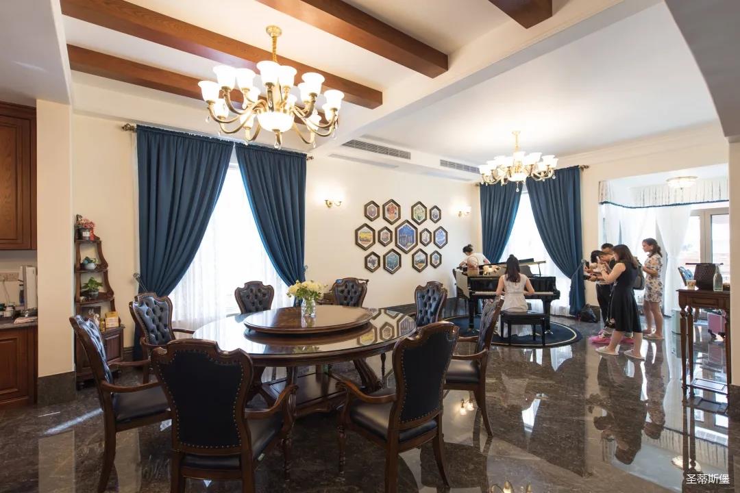 玄關進入轉角處,以穩重大氣實木為主色調的開放式中西餐廚空間,將一體化無隔斷設計貫徹到每個細節,采用了親膚真皮質感的餐椅,手工雕刻的曲線讓原本硬朗的空間變得格外優雅,自上而下,構成完整的美式空間氣度,在每天的生活點滴間,沉浸在美式風情中,更加隨性舒適。