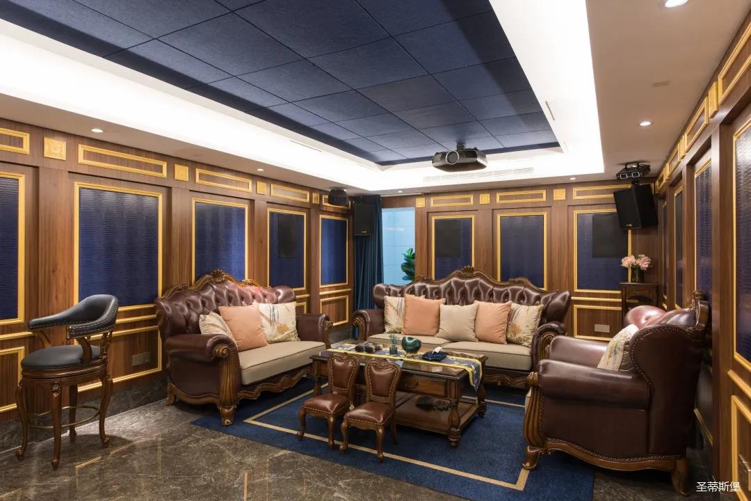 業主夫婦非常熱情好客,平時工作之余也會在家里邀三兩好友一起觀影,觀影室的整體設計容納著濃烈的古色古香,長方形圖案排列搭配復古的家具與配飾,精細的雕花藝術,于細節之間演繹著精致生活。不管時光如何輾轉變換,家的定義從不曾改變,它撫慰著我們的心靈,承載著我們的喜樂,從細膩的質感中感知家的點滴變化,才是對生活最真實的寫照。