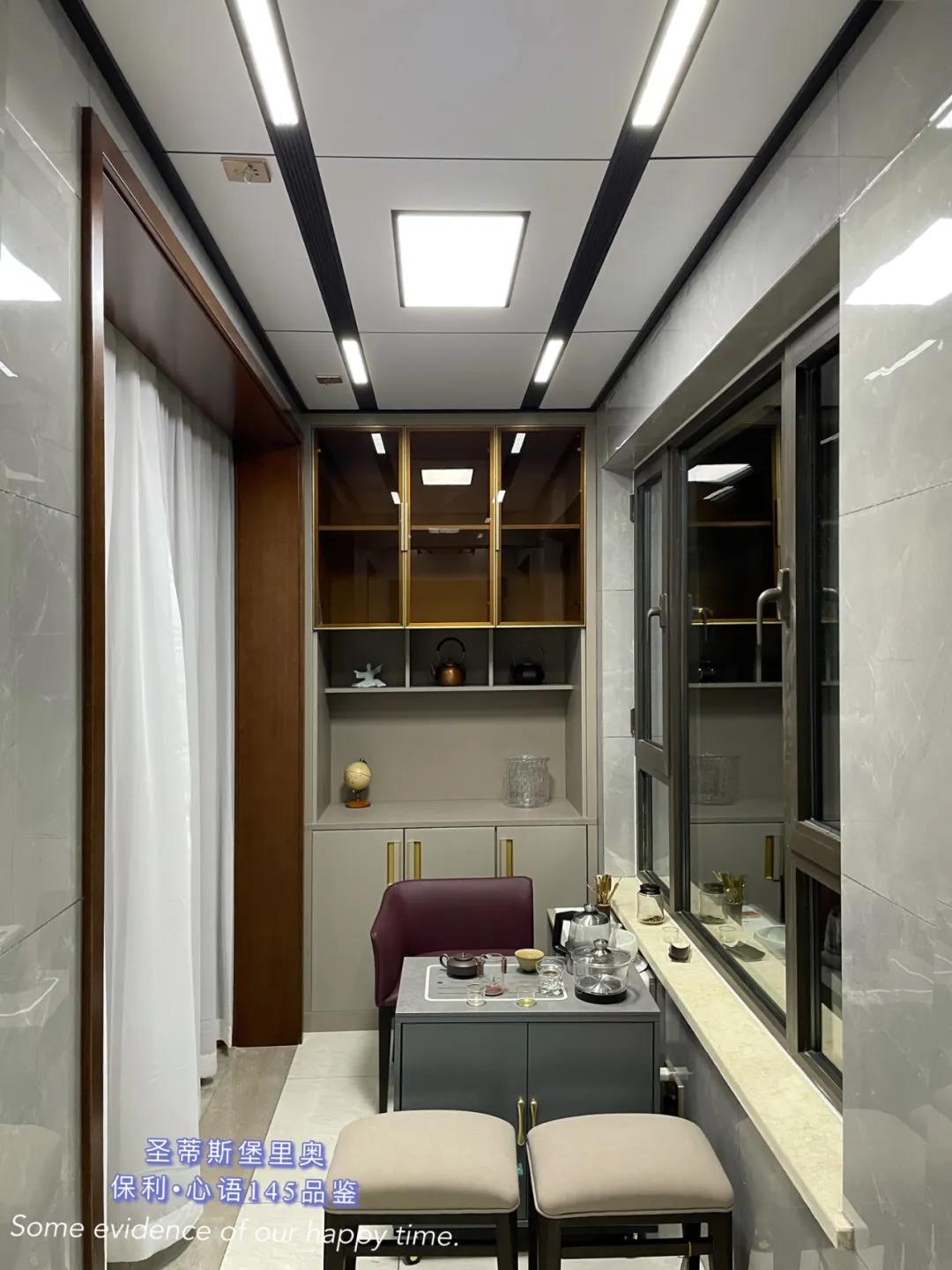▲餐廳一面及頂的透明柜體,以簡練的金屬線條分割出收納空間,讓立面視覺更顯精致干凈。餐邊柜設置了臺面、全玻璃展示區以及隱藏收納區,滿足了日常生活中多樣的收納需求。