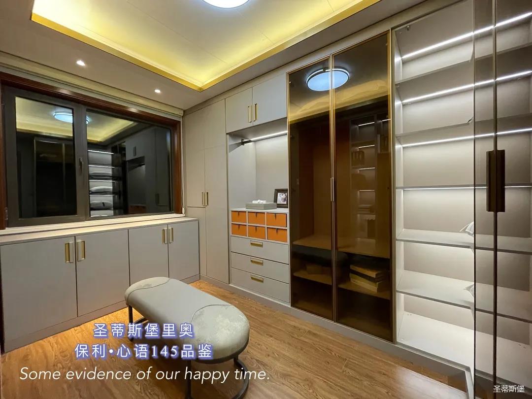 ▲衣帽間是用一間房改造的,衣柜開放式的布局處理,不但釋放了空間的狹隘,也營造出了具有觀賞性的空間格局,淺灰色調打造柜體基底,凝練出現代簡約的生活質感。柜體中安裝感應燈帶,光線流瀉其中,襯托出材質的自然肌理,溫潤細致的實木與剛硬冷冽的低奢金屬相互交織出一個極具質感的儲物空間。