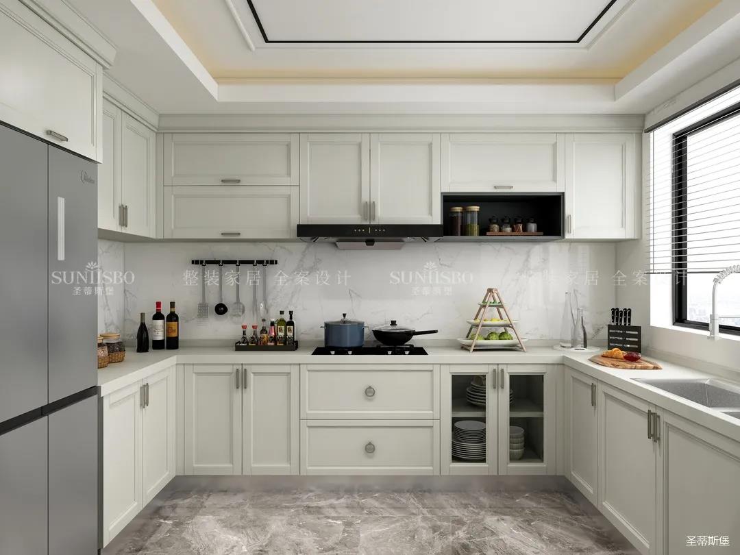廚房從屋主的飲食習慣出發(fā),運用溫柔的莫蘭迪色彩(仿古白)打開了美式櫥柜定制的新世界!在美式輕奢的基調上,進行線面模塊的靈活組合,在滿足廚房基本需求的同時也將儲物優(yōu)勢傳達到每一細節(jié)處。