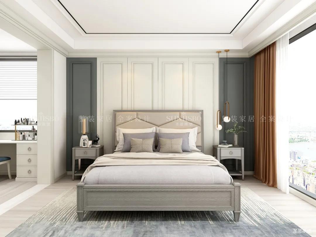 主臥在最大程度上表達了業(yè)主太太最愛的線性美,背景木飾面保留了純粹的視覺體驗,深灰與米白按比例調和搭配,深淺碰撞,在跟隨時尚的同時,也形成了秩序感的層次劃分。
