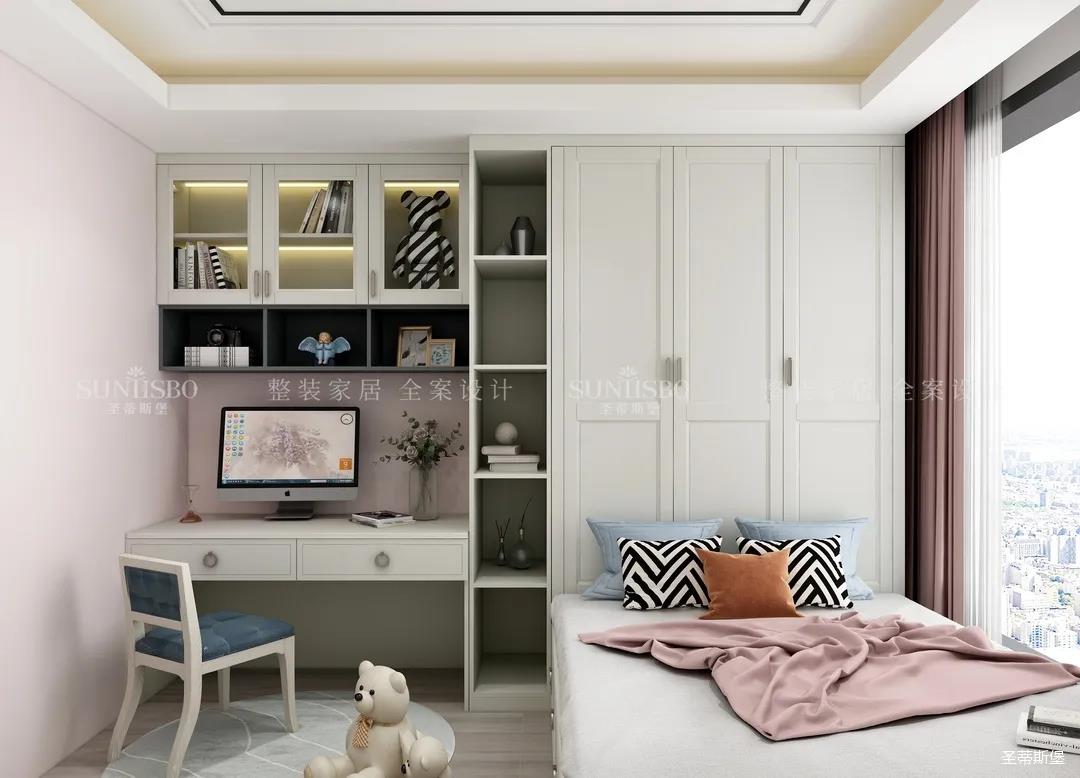 考慮到兒童身體免疫系統(tǒng)尚未成熟,抵抗力相對會較弱,所以空間采用了E0級全實木打造,少女粉墻體與仿古白柜體對應搭配出兒童空間的平衡點,典型的榻榻米+書桌的設計,既保證了足夠的學習區(qū),還兼顧著收納功能。