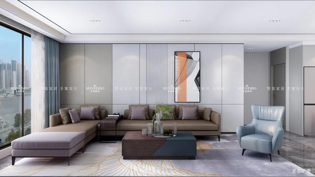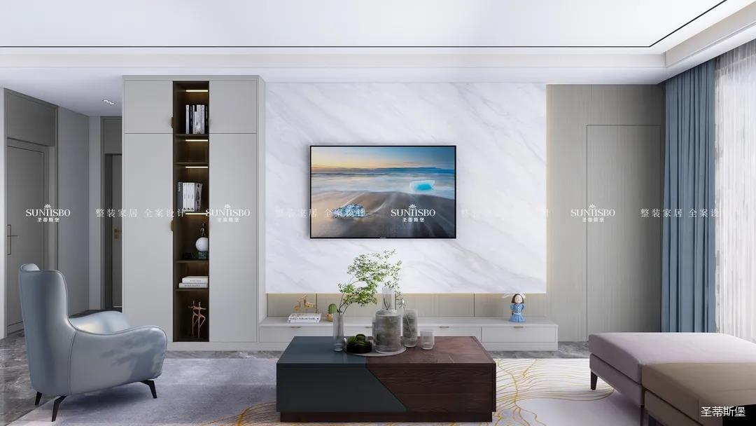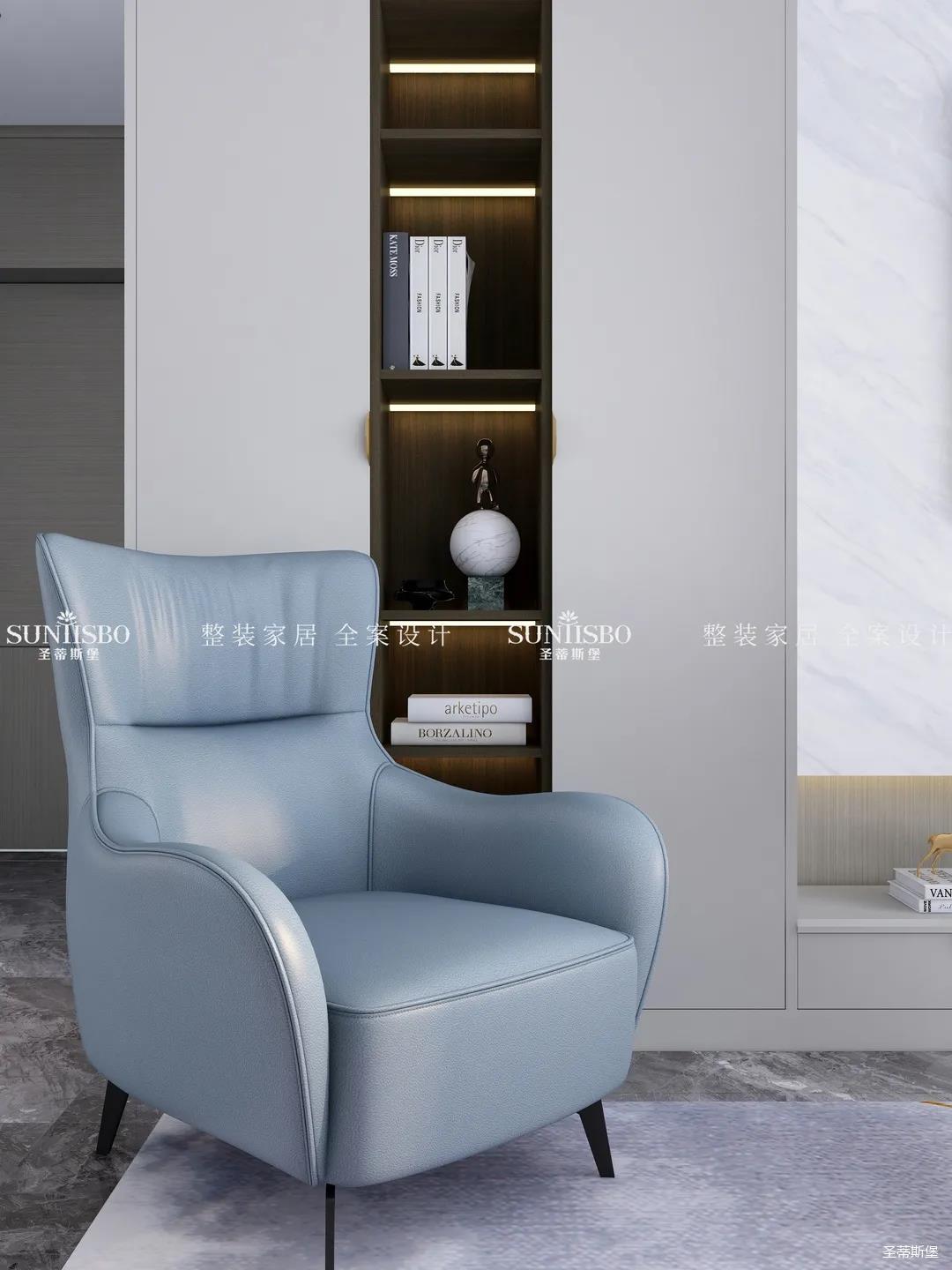 優雅淺灰L型定制柜與紋理清晰的大理石組合電視墻,滿足了業主審美與實用的雙向需求。一張淡藍色的休閑椅,讓業主能感受到亮麗明艷色彩之外的獨特,低調不張揚,卻在溫潤中傳遞出色彩的力量。通過紋理清晰的護墻為底,為柔和優雅的靜態客廳增添了層次感十足的空間律動。