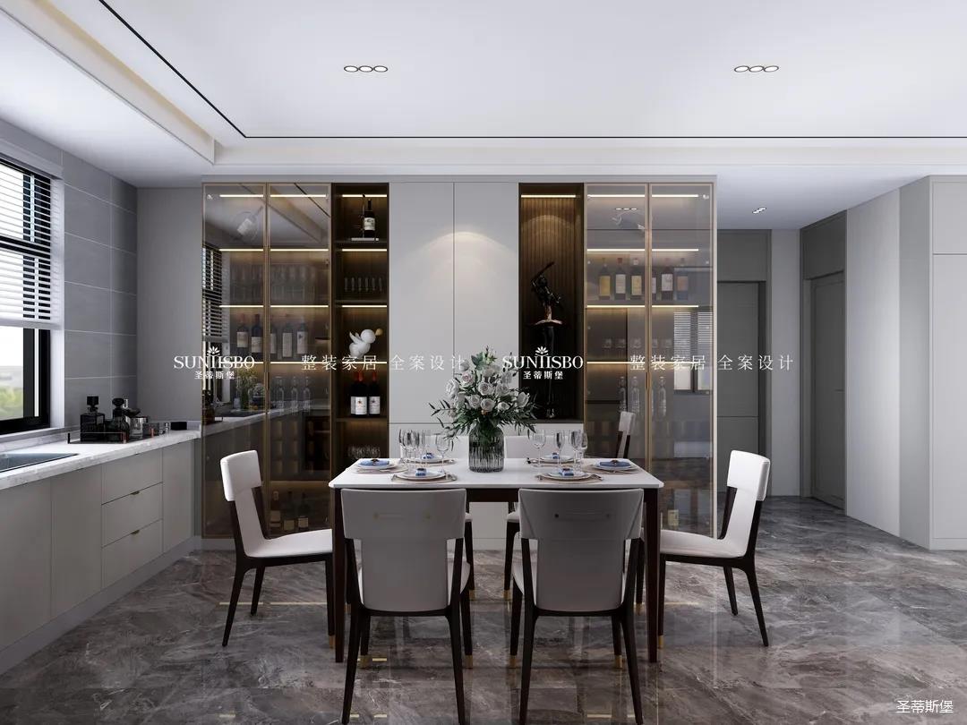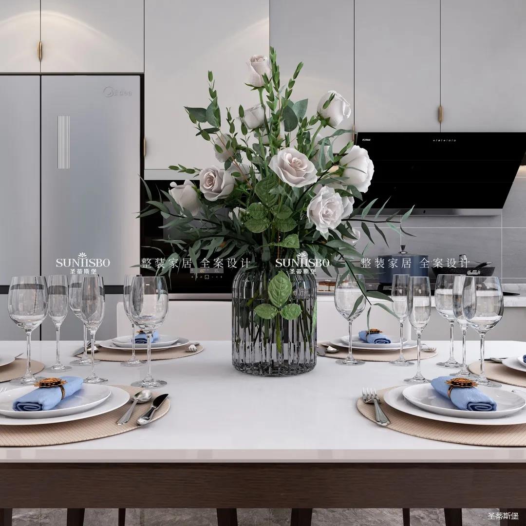 餐廳中大理石肌理的桌面自然袒露,自然親膚的觸感、皮革質感的現代餐椅坐感舒適自然。沉穩的實木材質延伸,精致的瓷白餐盤搭配金屬質感的物件,通透的玻璃器皿點綴其中,契合了業主對品質生活的追求。