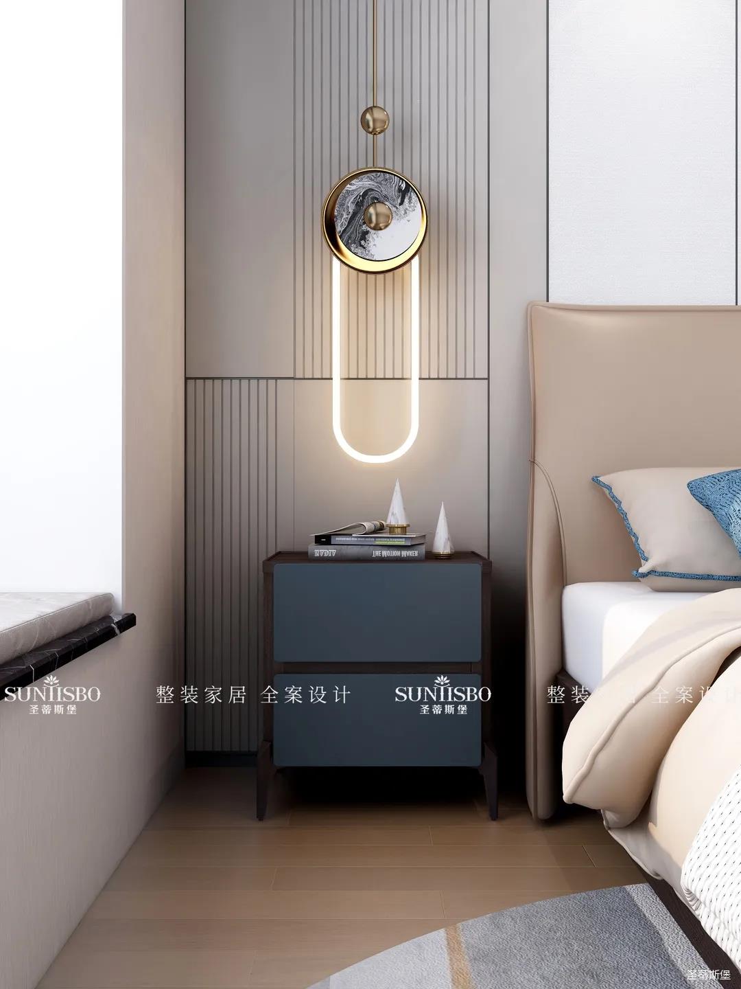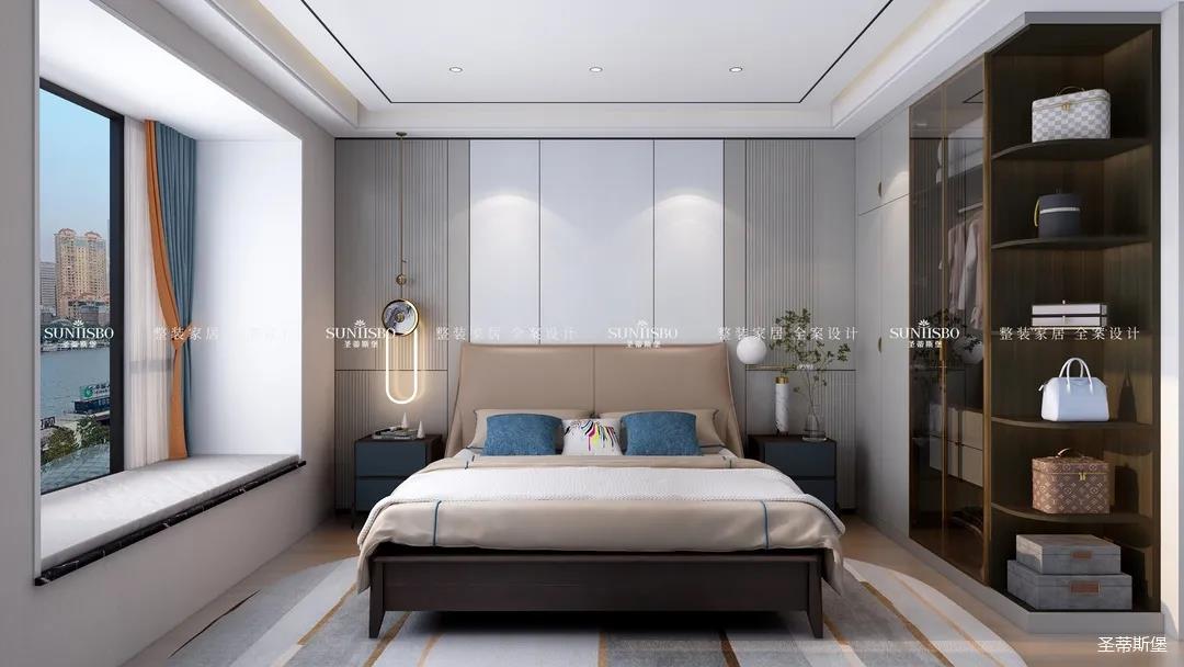 臥室把自然光線納入空間。穩重的淺咖色床屏搭配柔和的灰白護墻,渲染了空間去繁從簡的設計。品質精致的床品面料觸感自然柔軟,真皮質地的家具匹配空間氣質,為業主營造了舒適愜意的休憩空間。