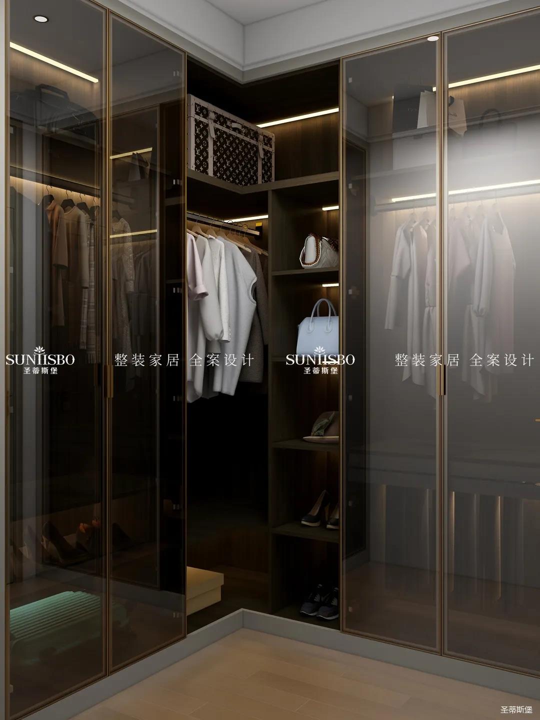 L型衣帽間采用了玻璃與實木組合,用時尚的煙熏色打造純凈質感,避免了全實木柜門的無趣。人性化的分區包含了鞋架、褲架、首飾收納等,將衣帽間的實用性靈活設計成業主的收納習慣。