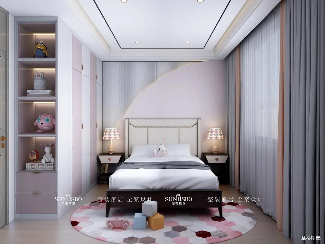 兒童房相對于其他空間更立體自然,幾何紋理的床屏和床頭柜延續了空間獨特的設計元素,菱格形的地毯,色彩交錯排列,滿足了兒童房應有的童真與想象力。粉白相間的定制收納,搭配同色系充滿童趣的動物公仔擺件,儼然成為了兒童的夢幻小天地。