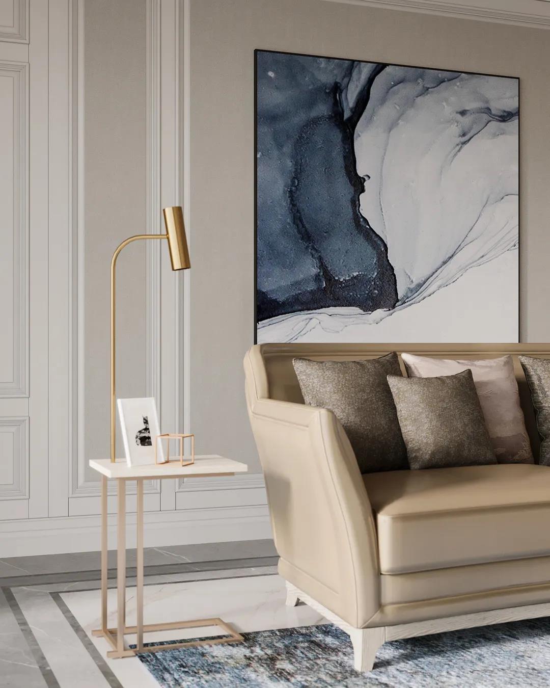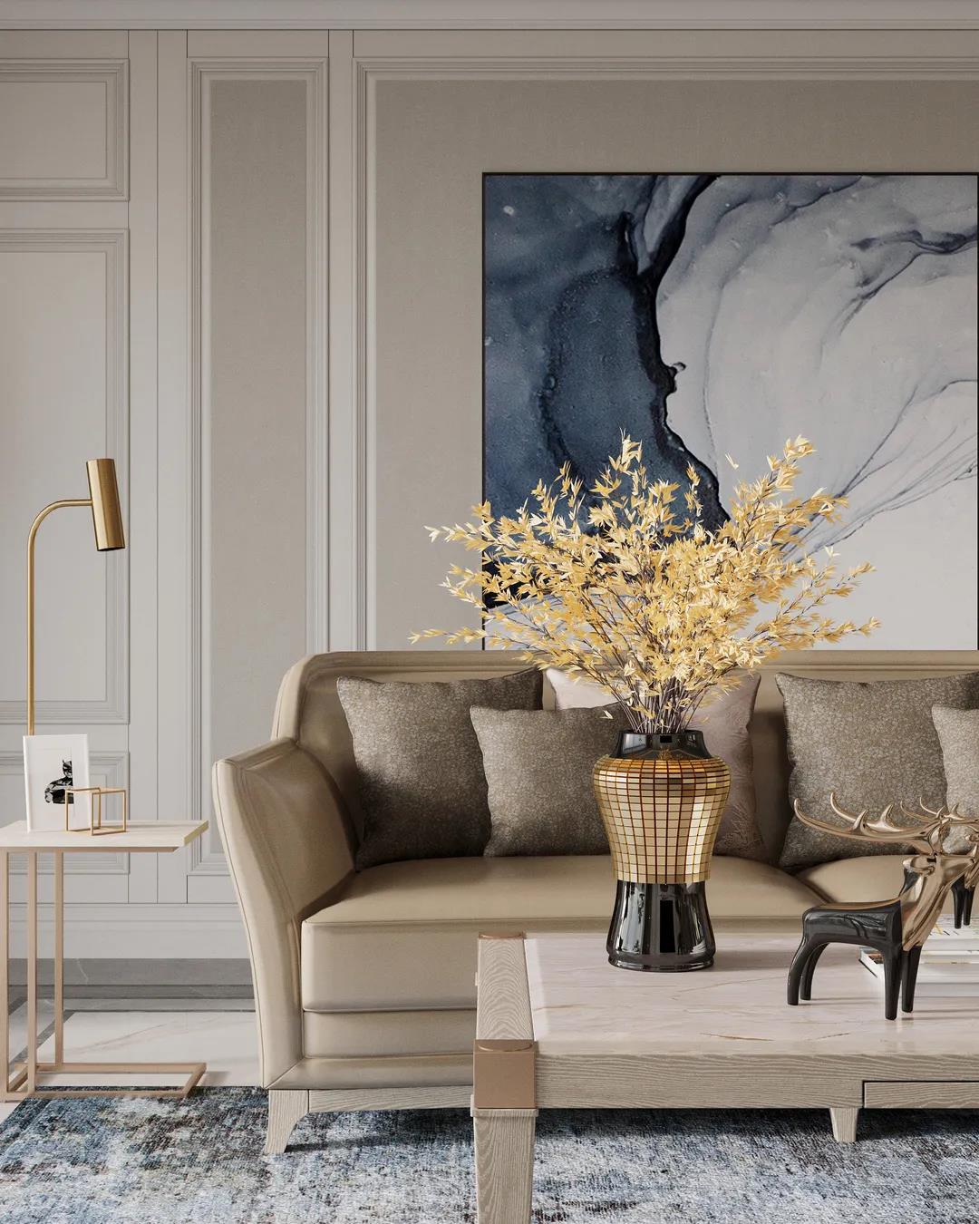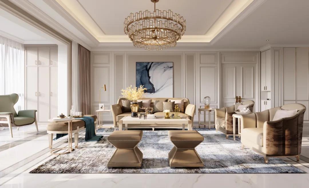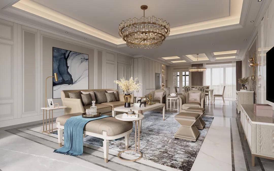 本案定位美式輕奢風格,設計師提取了業主喜歡的顏色添加至空間中,并運用金屬元素滲透到每一個空間,統一色調。在設計上,格局大而不空,以優美線條雕琢空間語言,材質肌理間的碰撞融合,打造出層次豐富的藝術感。