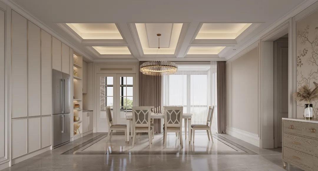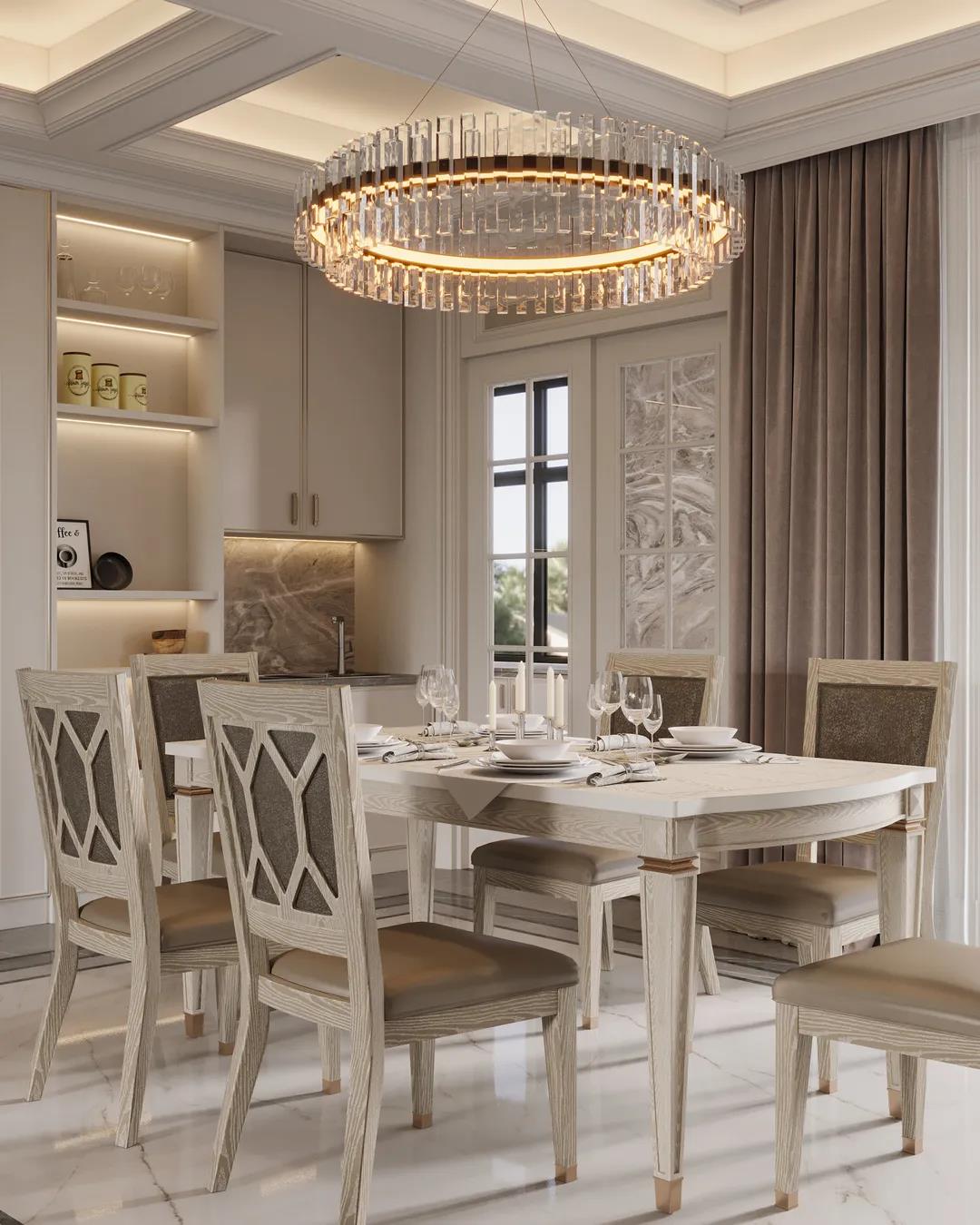 在華麗而精致的餐廳中,仿古白的餐桌椅搭配通透的水晶高腳杯,兩者交相輝映,用餐儀式感十足。墻面的護墻板和酒柜呈現一字型設計,一方面增添空間整體的豐盈感,還強調出個性現代的輕奢布局。