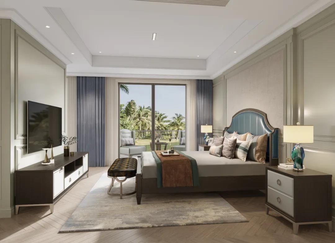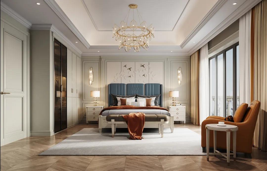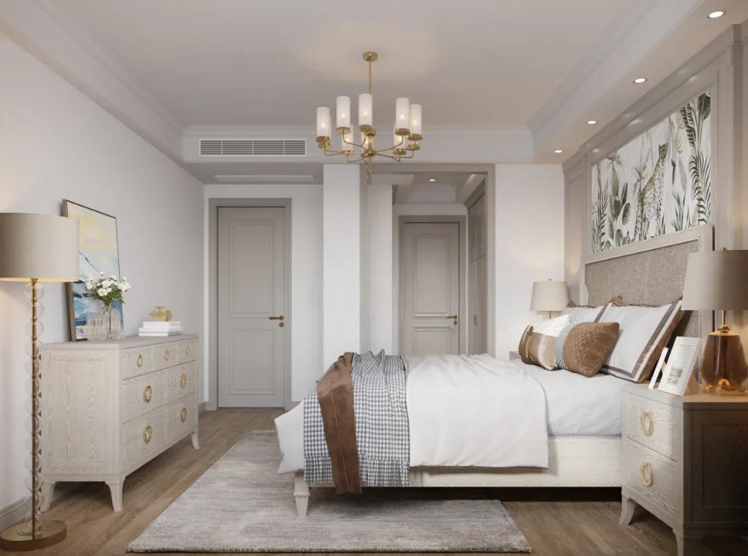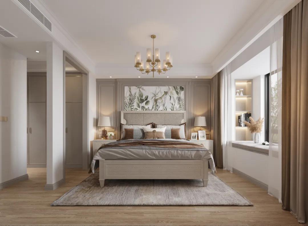 主臥以線條元素做主導,軟包的床頭墻面充滿安全感,浮雕的造型給空間布局帶來了極佳的層次感,以現代美式輕奢框架為主題,融入了美式靈動的線條,讓整個臥室既有時尚質感,又有時光打磨后的穩重。